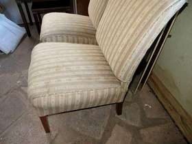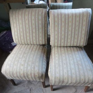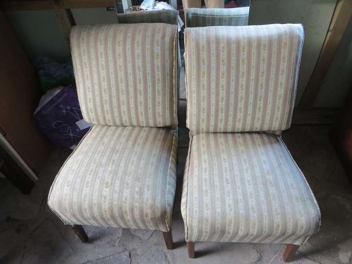 Matching pair of low chairs. Ideal as occasional furniture for bedroom . Sturdy and fabric ,although faded, has no rents or tears. Known as nursing chairs.