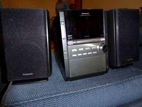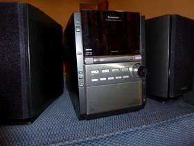 Panasonic Hi Fi system with CD x5 player; tape deck and radio FM /AM (15 presets each) Black wood effect speakers with wall mounting brackets. Audio System Component main unit / speaker system Width 4.8 in / 7 in Depth 10.2 in / 14.9 in Height 9.7 in / 9.8 in Weight 11.9 lbs / 5.1 lbs