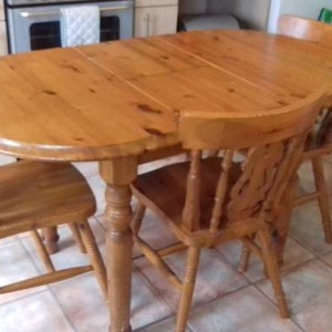 Solid wooden extendable table with three matching chairs. In usable condition however, table top could do with a sand down due to staining and marks. Measurements Diameter: 105.5cm Extended Length: 139.5 Height: 76cm Width: 82cm