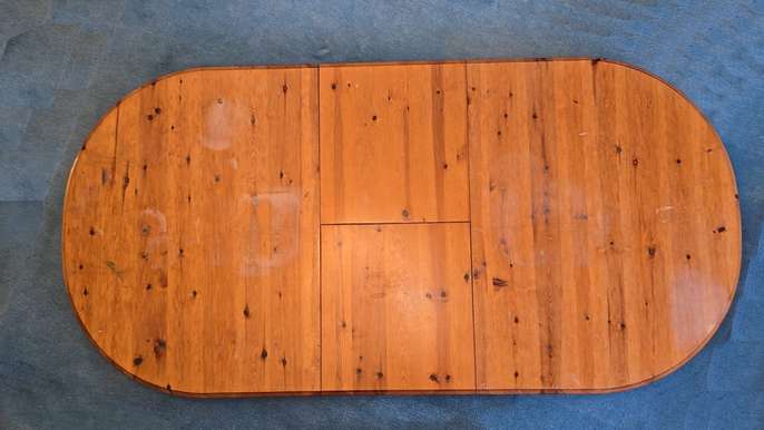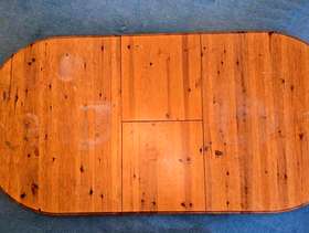 Extending Pine Dining Table. Solid wood, with hinged extension hidden under the table top. Easily extended as table top moves on ball bearing slides, and extension piece is hinged. Table top clips tightly together when not extended and when extended. Quite compact when not extended. Easily seats four, expanding to seat six comfortably, with the option for more because you can sit around the circular ends. Oval shape, with subtle decoration around the edge. Good condition but with some surface blemishes in the varnish. Marks look as if they would sand out if required. Already dismantled, so ready to go! Sorry didn't take a photo before taking it to bits. Length 55" 140cms Length when extended 71" 182cms Width 35" 90cms Height 30" 76cms