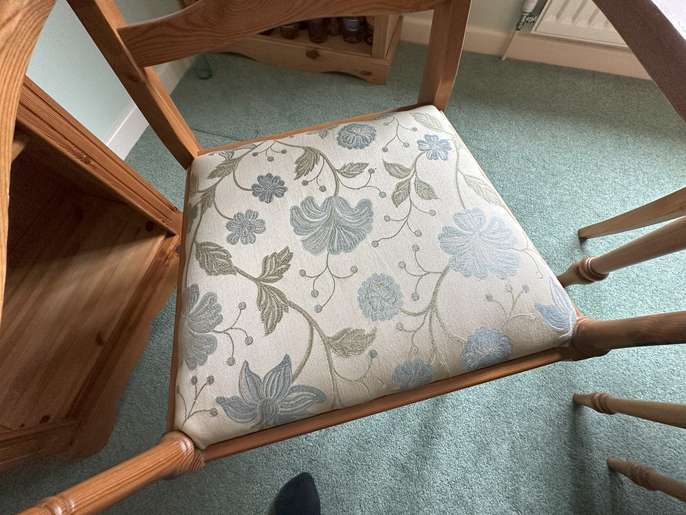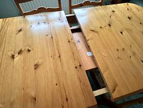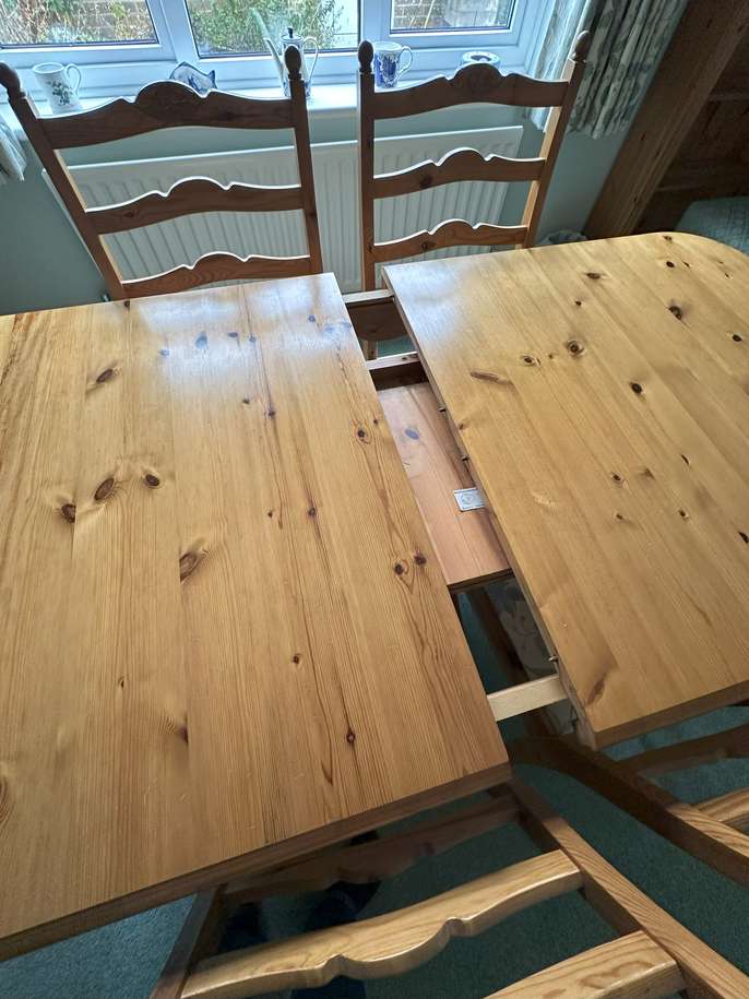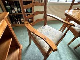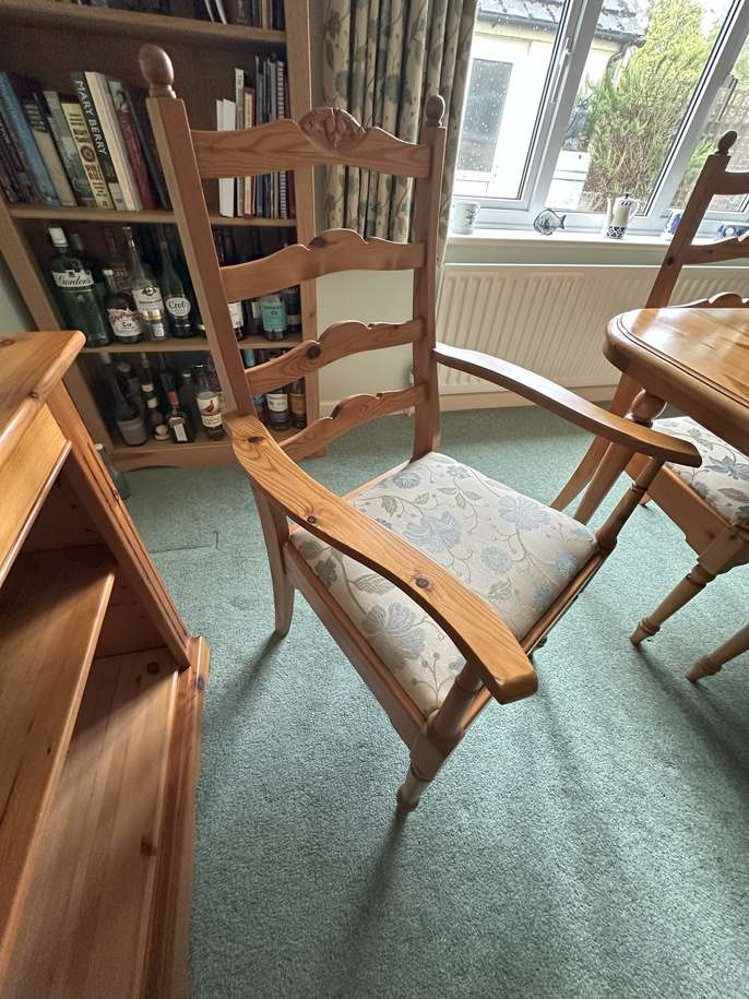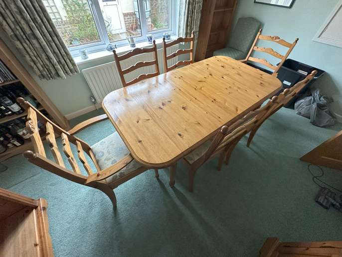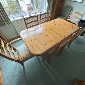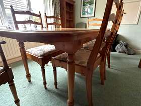 Pine extendable dining table plus 6 upholstered chairs (cream, pale green pattern). Good condition (no tears or obvious marks on the Chair upholstery etc), around 30 years old hence no current fire safety certificate for the upholstered chairs. Dimensions of table: Length: 165cm Width: 91cm Height: 80cm Collection from Emsworth only.
