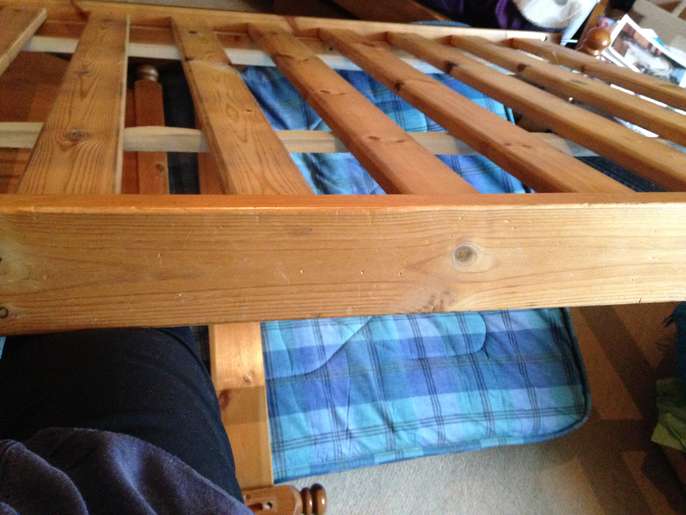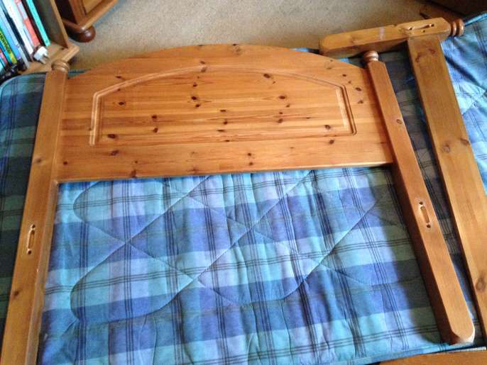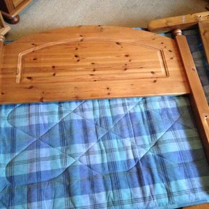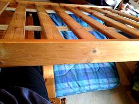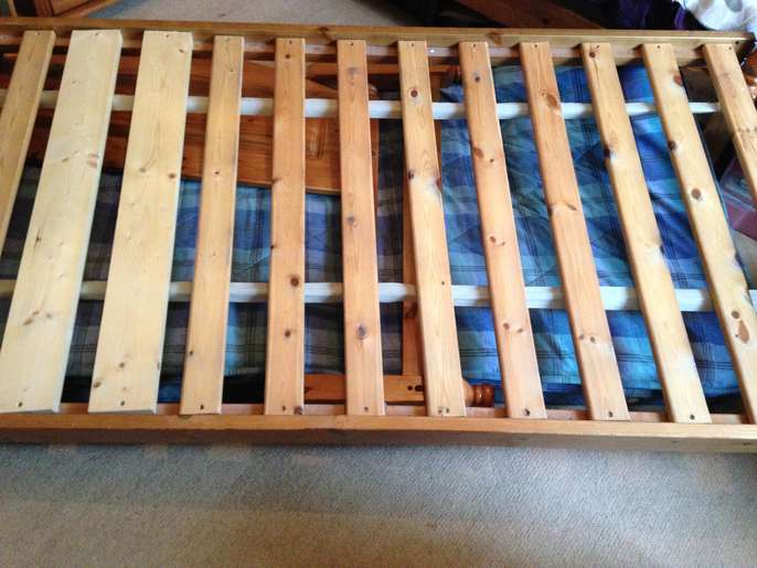 Used pine single bed, intact, some dents from use and a couple of slats have been replaced.