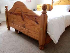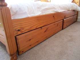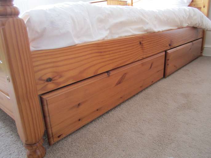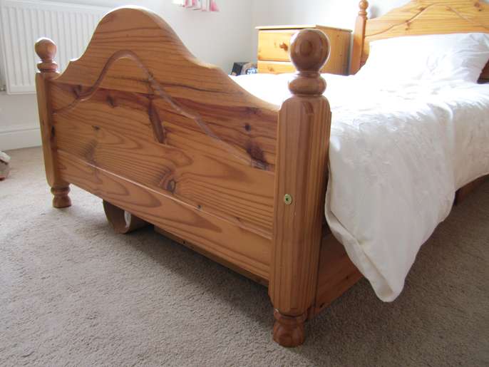 Solid pine bedframe in good condition complete with 2 drawers that fit underneath (NO MATTRESS), must be collected by Wednesday 20 June free to a good home!