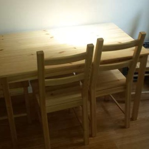 Ikea INGO/IVAR dining table and four chairs. Unvarnished pine. http://www.ikea.com/gb/en/products/tables/dining-sets/ingo-ivar-table-and-4-chairs-pine-spr-49097350/ Very good condition, as purchased new less than a year ago. Units do disassemble, but the tabletop is unavoidably 120cmx75cm, so would require a large vehicle for pickup.