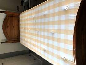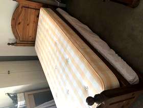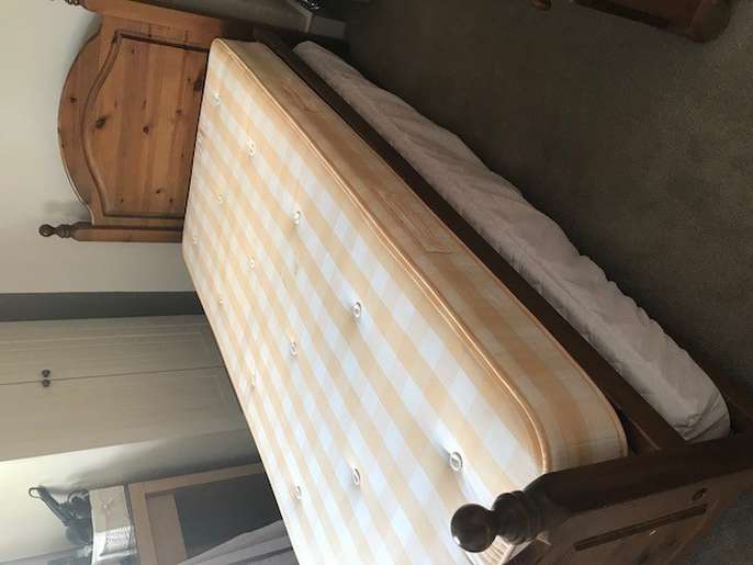 John Lewis single pine bed with guest bed stored away underneath. Approximately 15 years old but only used for 5 years before becoming a rarely used spare bed. Both mattresses are available although they have some minor staining. A repair was carried out 12 years ago using a metal bar, this is not visible. Can be taken apart for easy transportation.