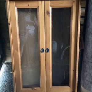 Antique effect pine wall unit with glass doors and glass shelves. 120cms high and 60cms across