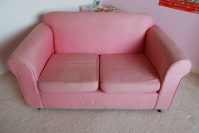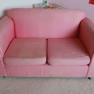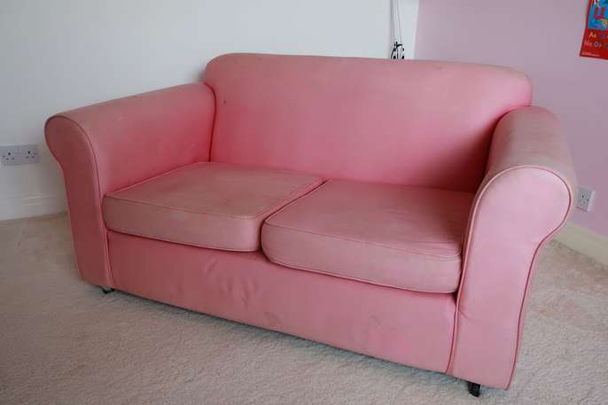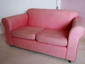 Pink sofa 150cm wide X 88 deep. Colour has faded, due to being in sunlight, otherwise OK; could be recovered, but OK with a large throw over it! Giving away to make space. Collection only from Malton.