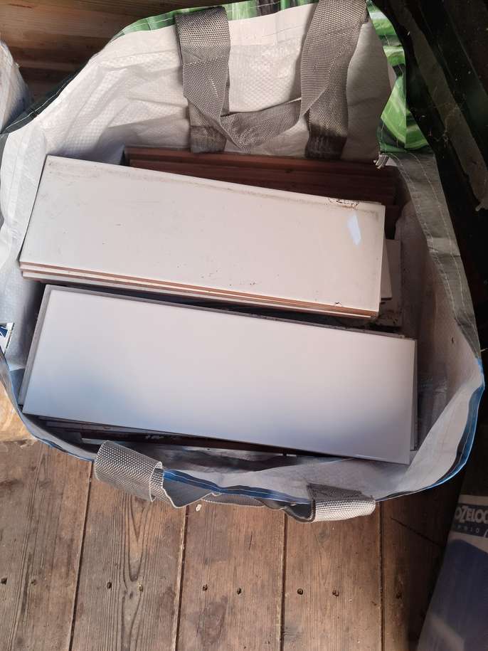 A bag of 50 plain white tiles. Size 30cmx20cm. Left over from a bathroom project. They have been stored in our shed. So dusty and in need of a wipe over.