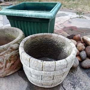 Picture for illustration - please note the are multiple pots of similar design and a large number of rocks and stones. Multiple plant pots of varying sizes and materials I.e plastic and concrete. Multiple rocks/stones perfect for keeping weeds from flower beds and using as edging in the garden