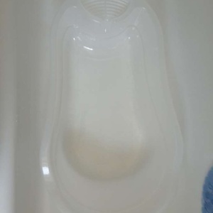Translucent plastic baby bath, small enough to fit in a bat or on a counter