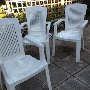 A set of three plastic chairs, ideal for patio or garden. They will need some cleaning with bleach or white vinegar. Available for collection anytime.