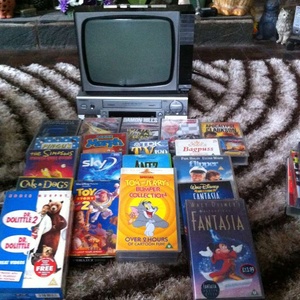 FERGUSON portable 12" tv either 12v battery or mains electric. VHS player both live when plugged in but not checked out otherwise not used for some considerable time but as far as I know in working order. about 24 VHS tapes most of them suitable for young children upwards and 2 from 12 +1from15 yrs must be collected from Feniscowles Bburn area