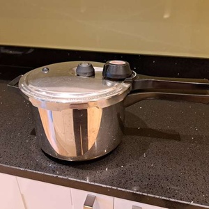 Prestige stainless steel pressure cooker with trivet, basket and instruction booklet. All good condition. This pressure cooker is suitable for all hob types except induction (the base is a composite material). The gasket should be replaced (needs to be replaced every year) - order from Prestige website. Pressure cookers are great for casseroles and stews, steaming puddings and much more and cook items in a very short time. Collection only.
