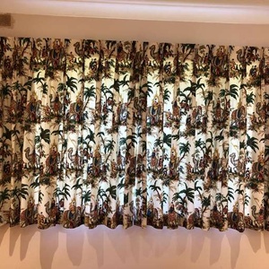 Pinch pleat curtains and corded track. Approx width 260cm Approx drop 141cm Elephant / camel / palm tree print with cream background, and pattern in various shades of green, brown, maroon, pink, blue and grey. Nicely made. Lining showing some dust staining but front looks clean.