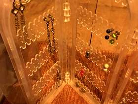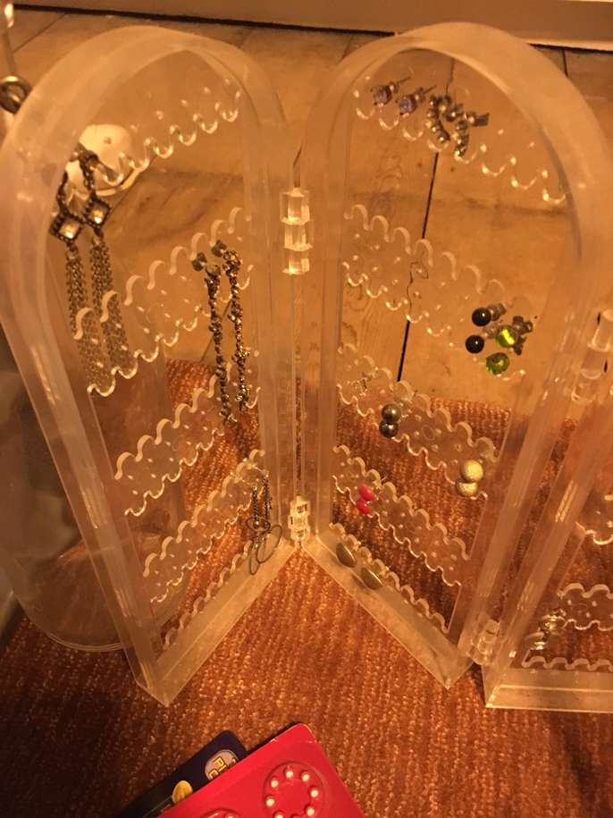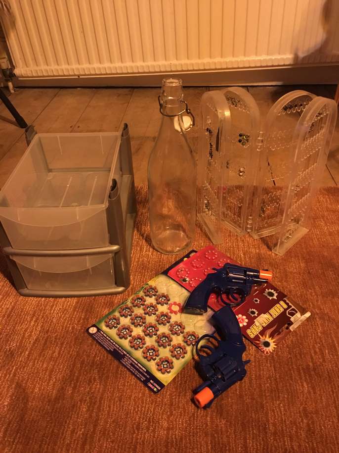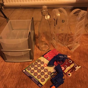 Plastic storage Toy guys and pellets Earring storage stand with some earrings Kilner style bottle Collection from west ealing asap please!