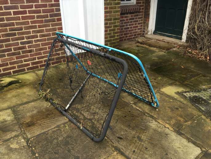 Rebounder - great for practicing your throwing and catching. One side does a regular return - the other a more random response. Needs restringing. See the manufactures name in the photo