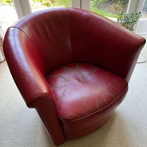 This red leather chair has a swivel base and quite compact dimensions (75cm by 75cm), so will fit a small space. The leather itself is in sound condition, but there are some cracks in the surface finish which can be seen in the photo. These could be treated — you can buy a suitable repair treatment on Amazon. The chair has a valid fire safety label.