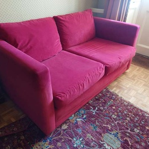 Red 2 / 3 seater sofa from a non-smoking household in good presentable condition for age. Washable removable covers (one zip and pinned) - which have been through the washer. Dimensions 160cm width 90cm deep. Very comfortable sofa with a sprung base - this was made for us by the Sofa Workshop - In Great Offley but could potentially deliver if close and if it will fit in our car.