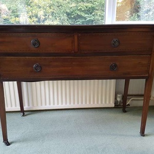 3 drawers (one long , two short). Four legs on castors. One castor is detached. We have it.