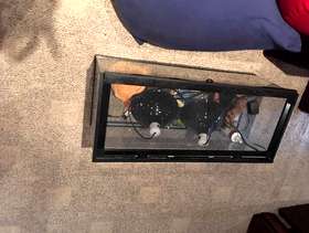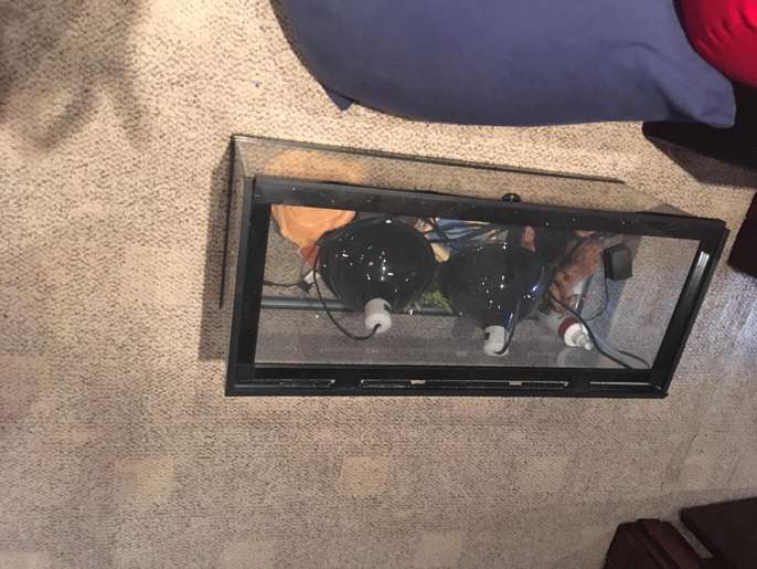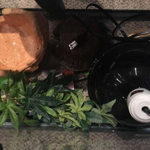 Approximately 20 gallon tank, first used to house two leopard geckos, later used to house one corn snake. Two lamps, water bowls and climbing branch included.
