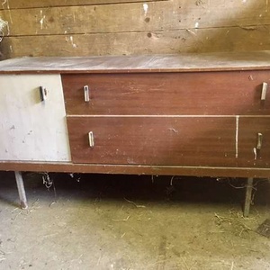 Varnished retro cabinet in need of tlc. 48" long, 16" deep, 25" high.