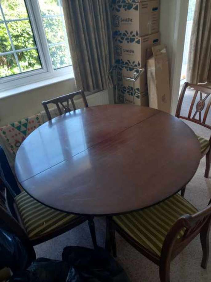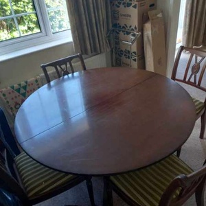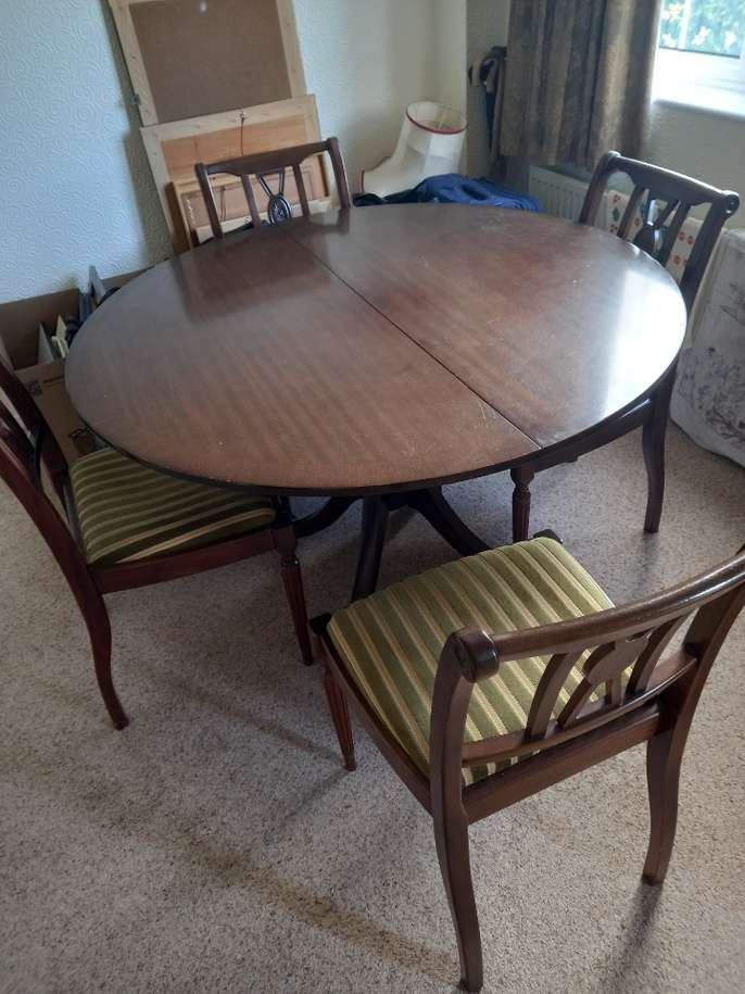 FREE Sits 4 people Table will extend to sit 6 Table and chairs can easily be sanded, painted and the chairs re upholstered. New owner to collect.