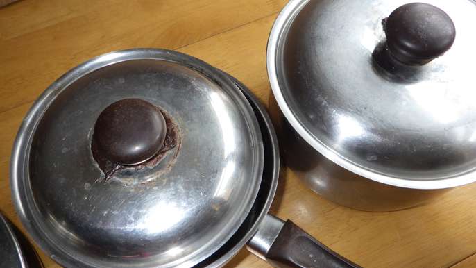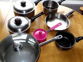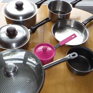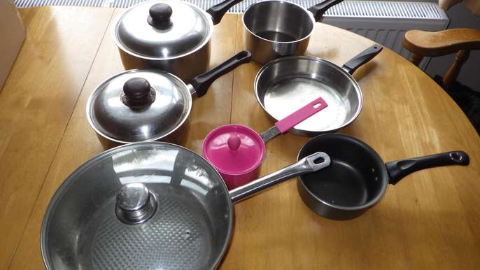 5 saucepans and two fry pans. Mixed material, some copper bottom, some non-sick. Not suitable for induction which is why giving away. Couple of lid buttons have heat damage.