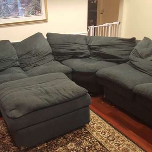 Hunter Green sectional with ottoman. 20 years old, worn in but comfortable. There are some tears behind the pillows and a broken leg but we propped it up and we sit in the sofa with no problem. Must be picked up August 6th!