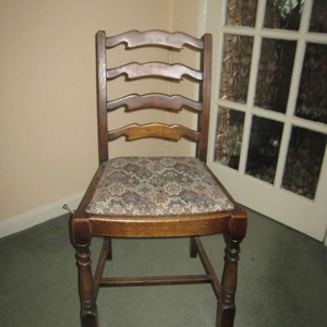 Set of 4 dining chairs in dark wood with tapestry fabric seats. The seats taper front to back 450 to 370mm and depth is 390mm. Seat height 450mm.