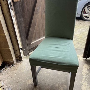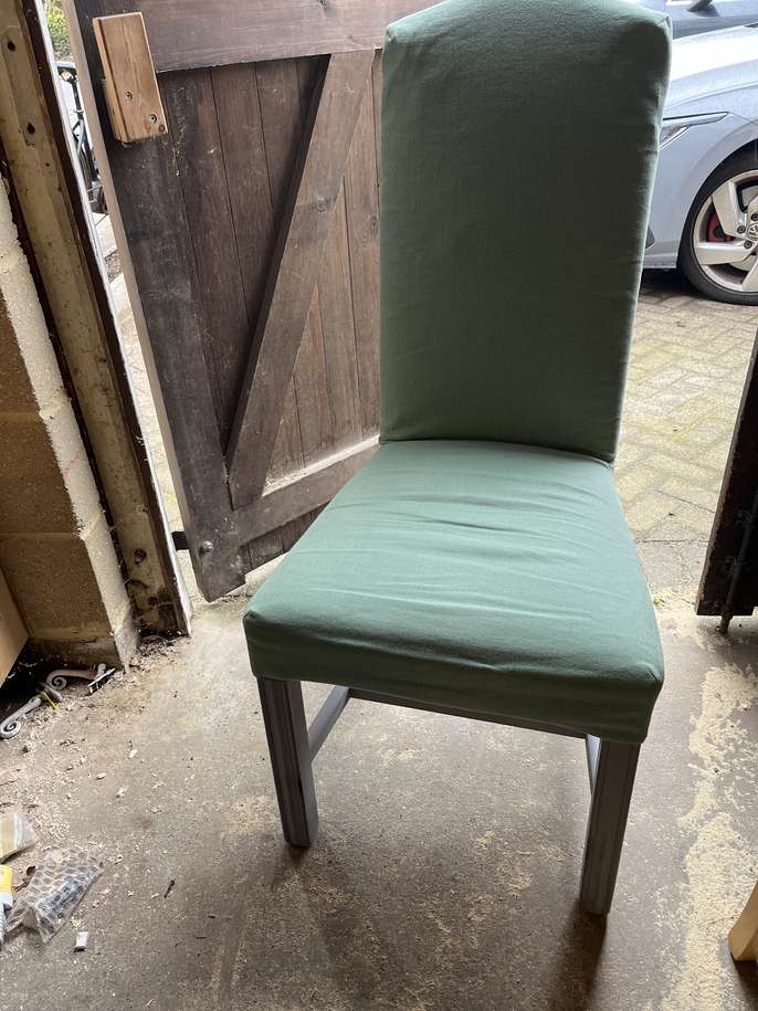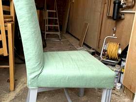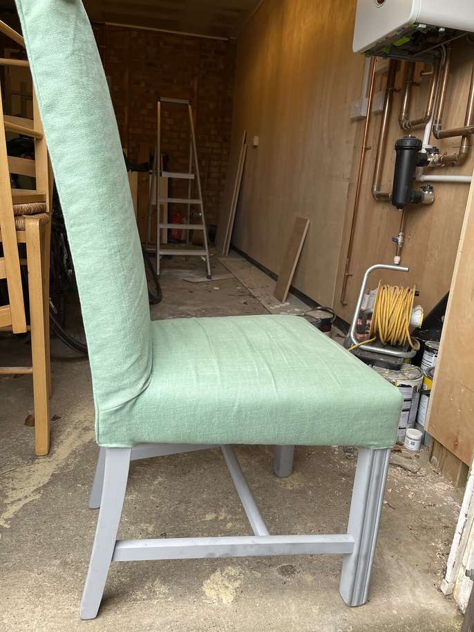 Set of eight upholstered traditional style dining chairs, very comfortable and solid, loose covers. Legs solid wood now painted, wood stain underneath