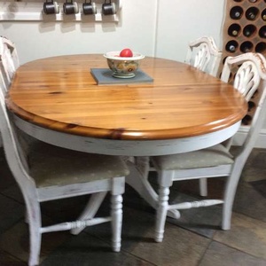 White and teak extendable table and 4 chairs. Picture shows it extended, will go down to circular. Chairs are covered green and white spot but can easily be recovered, have done it many times!