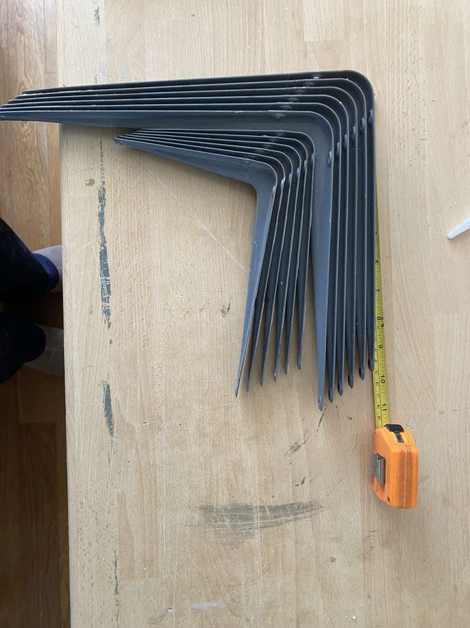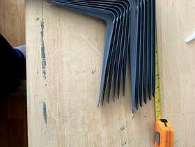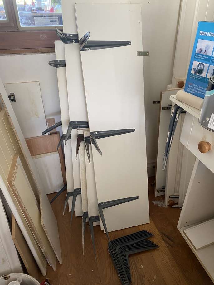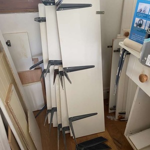 Variety of short white, Formica / chipboard shelves suitable for cupboard, garage, shed etc. Mounted on 20, 25 & 30cm grey painted, steel brackets to suit shelf sizes. 12 additional brackets free to go as shown in photos. Collection only please.