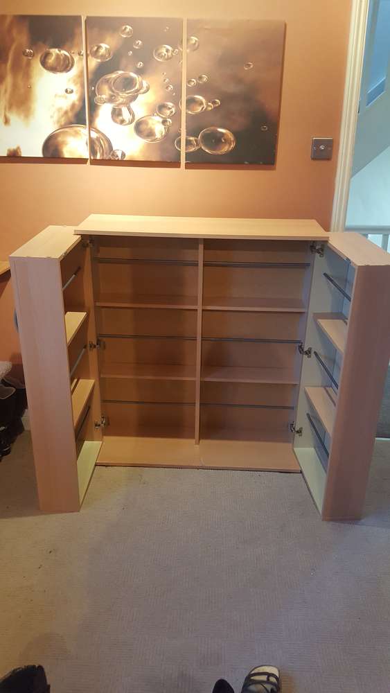 Length 94cm Height 108cm Width 32cm Used Ideally, this cabinet needs to be attached to the wall as it is very heavy. If you open both doors, it will lean over. I do not still have that attachment but it can be purchased else where. I left mine freestanding and it still served me well. Can fit up to 36 pairs of shoes. Getting rid of it because I don't need 36 pairs of shoes... :-) Collection only