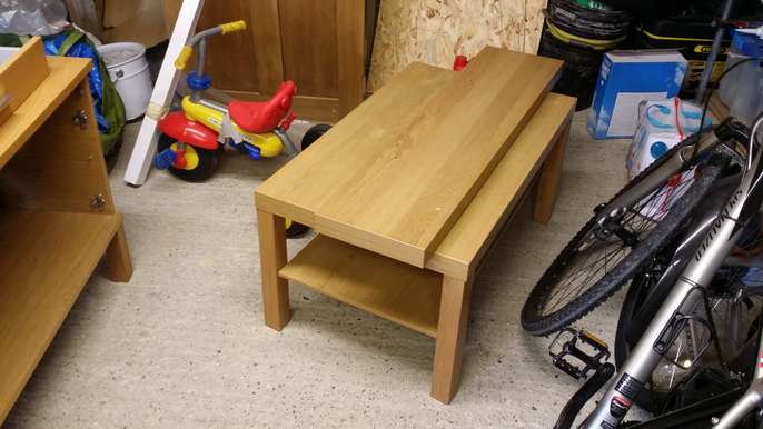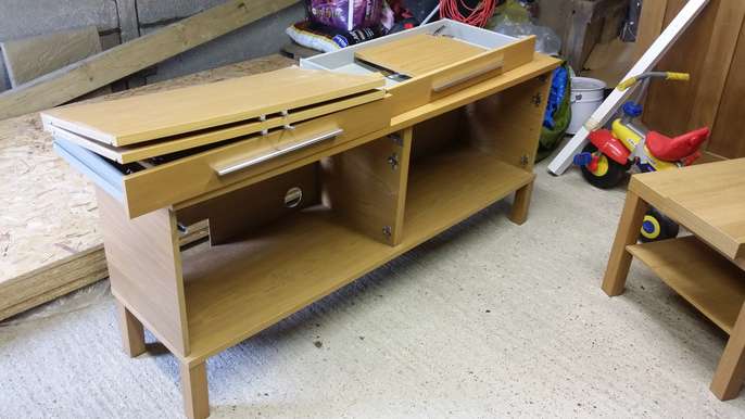 Side board (we used as a tv unit) with two draws and cobards. Matching coffee table and floating shelf. Wood effect.