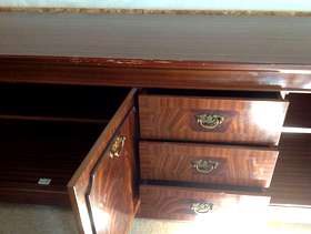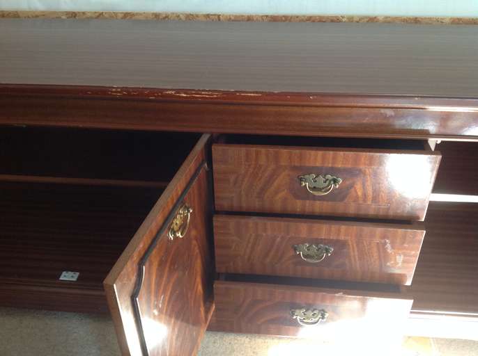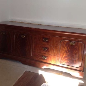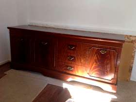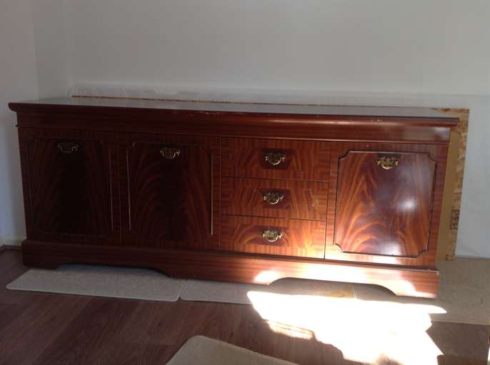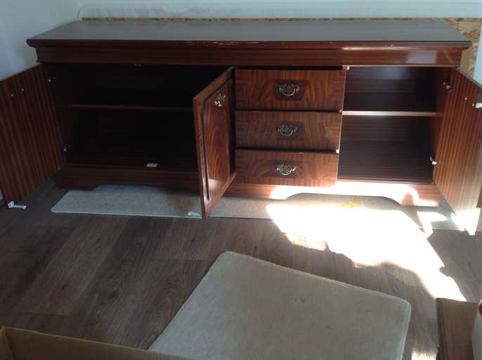 Solid wood, Side cabinet, approx measurements length 67 inches, height 28 inches, width 18. Has wheels for ease to move on wooden flooring. Must collect from Burnage