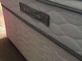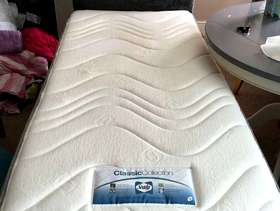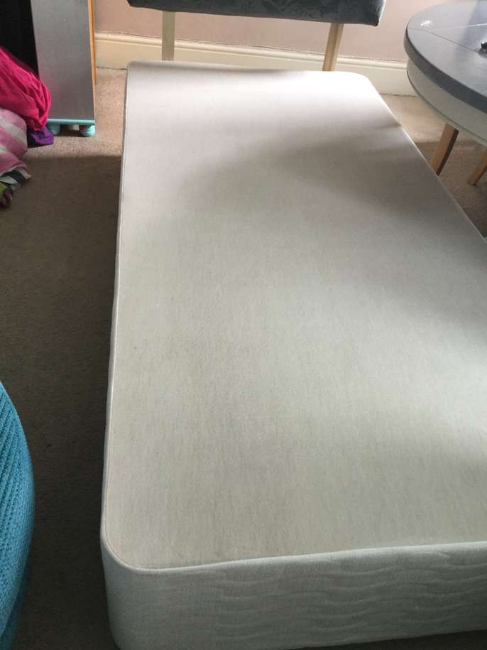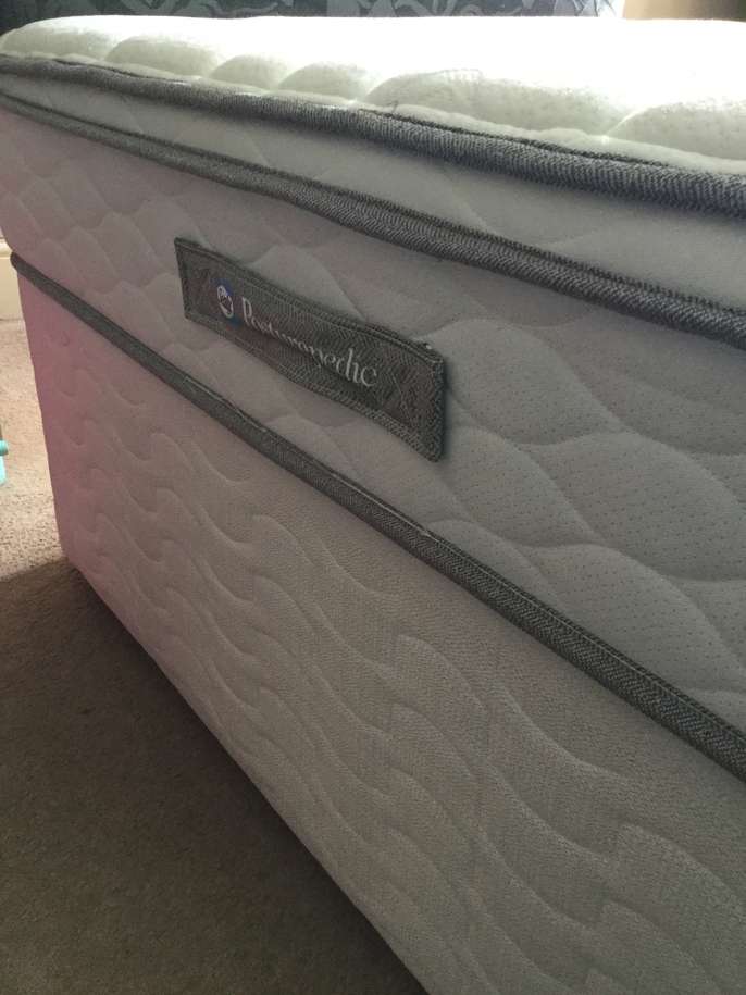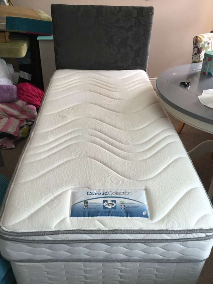 Single bed divan. 2 years old. Sealy posturepedic spring mattress pillow top. Grey headboard from Argos.