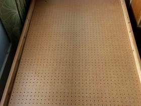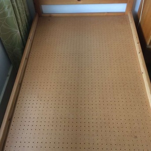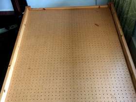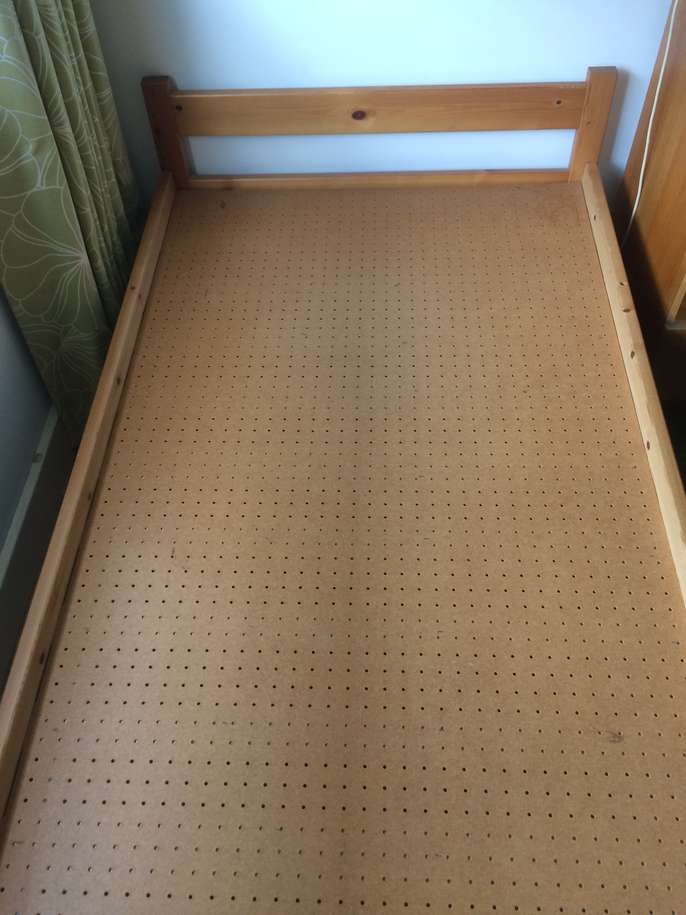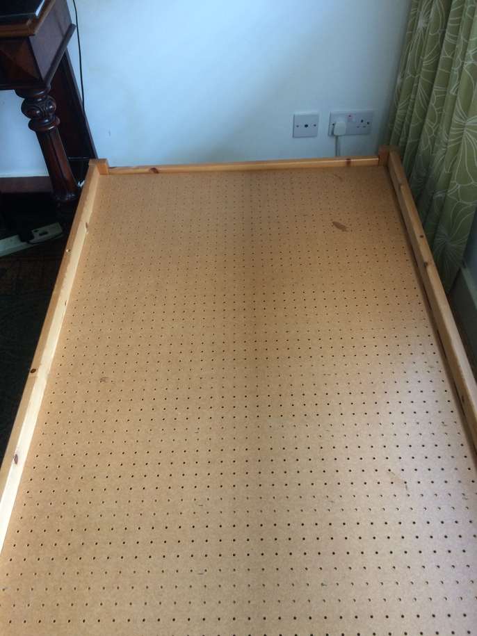 Pine wood single bed base (no matress) solid wood frame for standard single matress. Maximum Dimensions 96cm wide to outside of frame x 206cm long to outside of frame x 32cm high x 54cm high at head borad end. The matress base has wooden lats and a vented hardboard on top so it is very sturdy. Please note that the bed frame comes apart but the matress base is one piece 90cm wide x 200cm long. Please collect - no delivery available