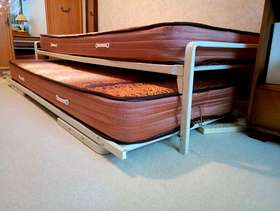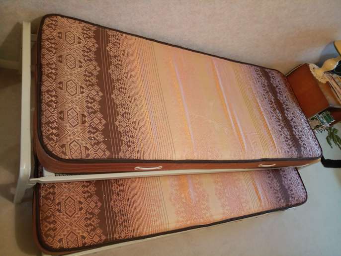 Two metal framed single beds in white that stand on the footprint of one but can be joined to create a double (or two singles). Mattresses included. located in Hythe Kent. Collection only