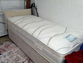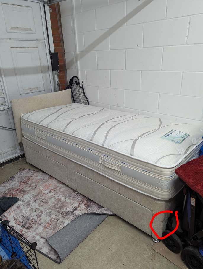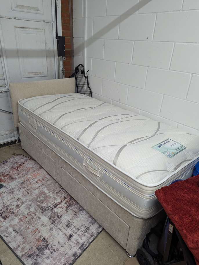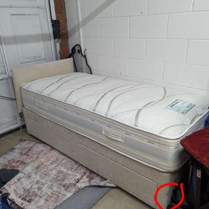 Single Divan Bed with under bed draws. Please note photo of scuff mark circled in the photo on the front right of the bed. Hardly used.