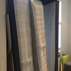 Small single (w75cm) with guest trundle bed. Both with mattresses. Trundle has foldaway legs which raise the bed to level of the other one to make a king size double. Very good condition, only used for occasional guest use. PLEASE NOTE the third photo shows a similar bed, but this is blue and doesn't have a head board.