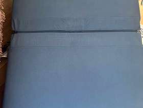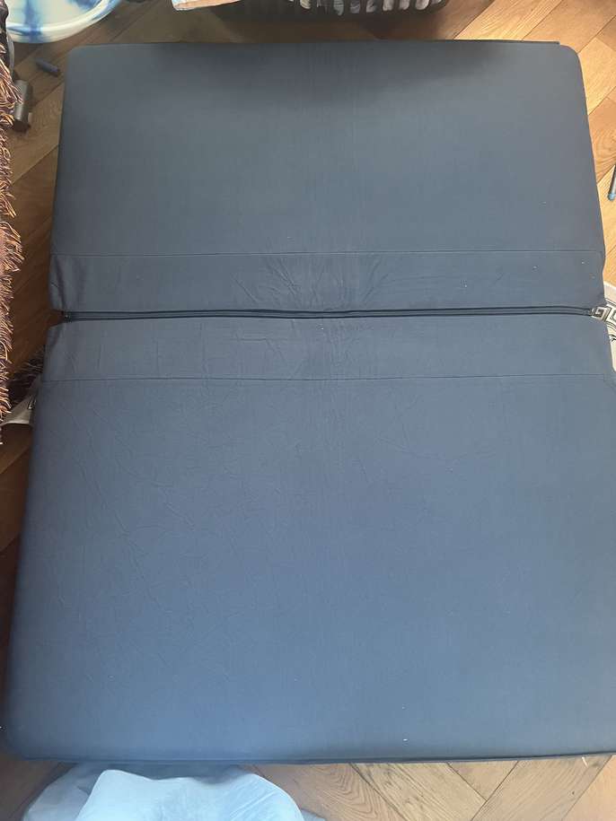This is a clean, hardly used blue single sofa bed which can be used as a seat or unrolled to create a small bed. The cushions are not attached to each other. The back opens out flat also. I need to clear this very quickly due to space. With a throw and cushion it makes a nice chair