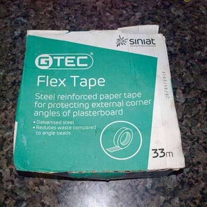 This is steel-reinforced paper tape for protecting external corner angles in plasterboard. The pack held 33m - I don't know how much (if any) has been used, but it looks pretty full.