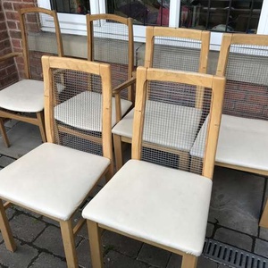 I am offering a set of 6 dining room chairs, two of them are carvers and four normal chairs. they are in good condition. All have cream leather bottoms the wood is beech.