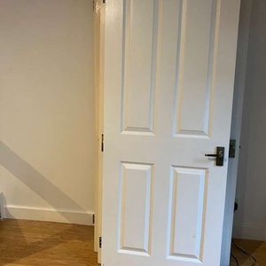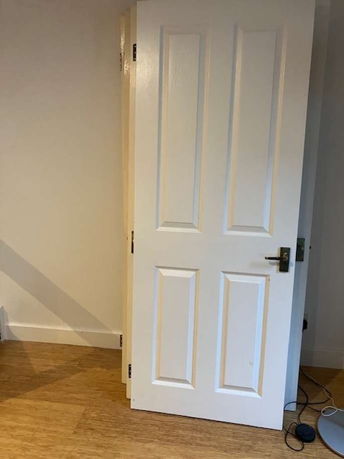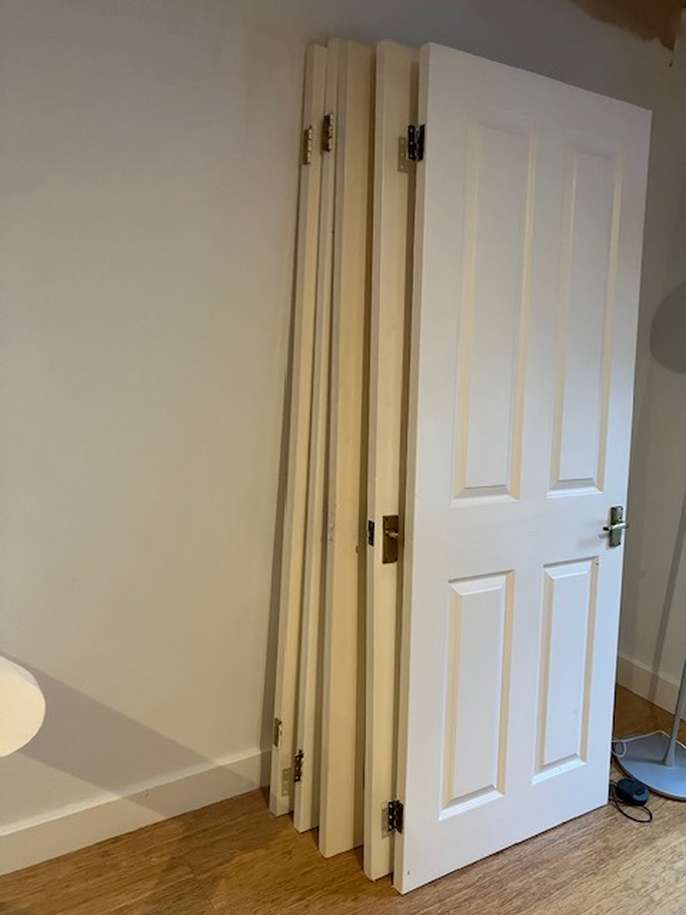 Six white paneled internal doors with handles . Dimensions : H 197 cm , W 76 cm , D 3.5cm You collect from property .