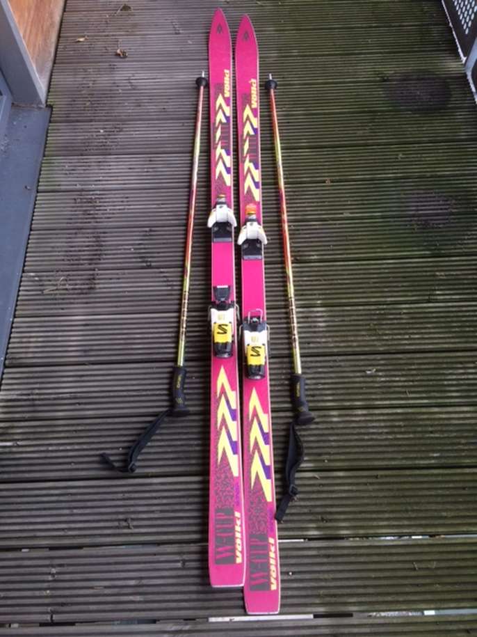 Pair of Volkl World Cup Skis (approx. 190cm long) complete with pair of Salomon 977 Bindings, Ski Poles and a bag. (Please note one of the bindings needs a minor repair). THIS ITEM IS AVAILABLE FOR COLLECTION ONLY FROM POSTCODE E3 3AF.
