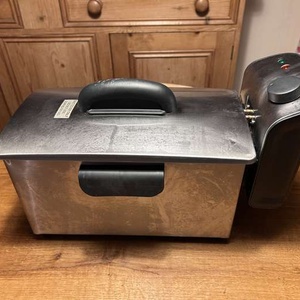 A small deep-fat fryer that sits on a work-top. In very good condition and in good working order. The outside casing measures 38cm long, 16cm wide, and 20cm tall.