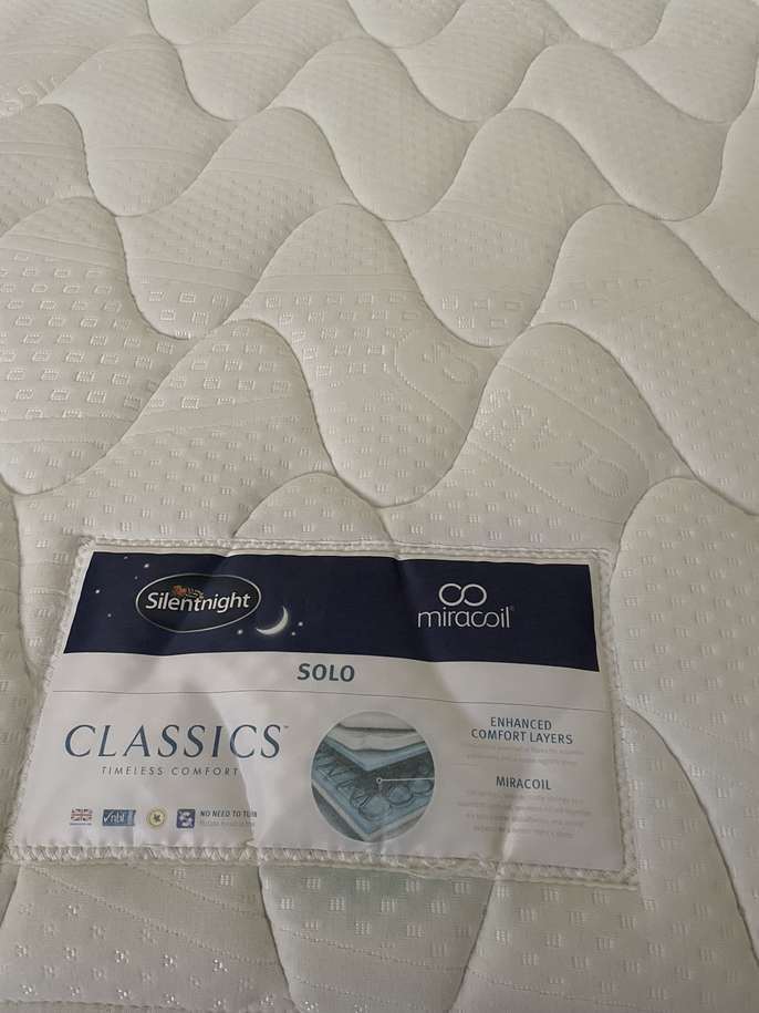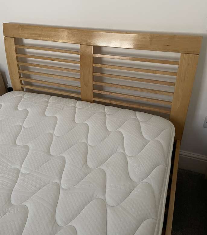 Wooden Frame slatted bed (from Fitzgeralds Stamford) 2 slats at the bottom missing. Firm mattress in excellent condition. 120cm x 183cm (4’x6’) Overall bed frame 128cm wide x 190cm long.