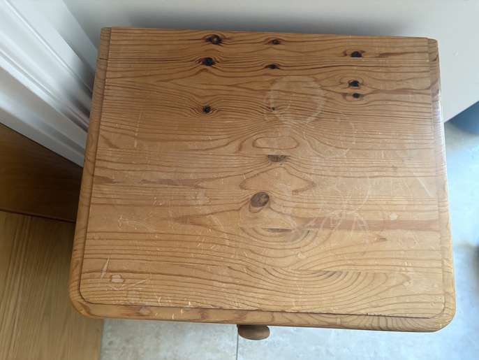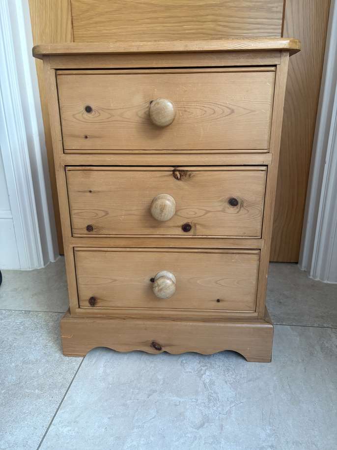 This is a good quality pine small 3 drawer chest of drawers suitable as a bedside table. It is 58 cm high x 43 cm wide x 35 cm deep It is in good condition but is marked on the top as seen in the photograph. Any questions, please ask.