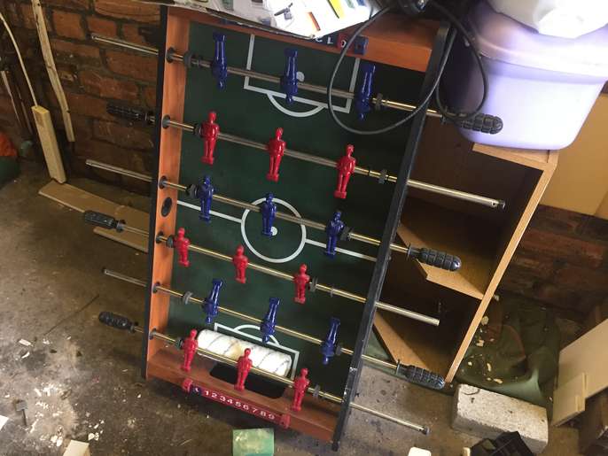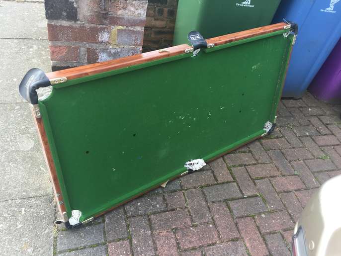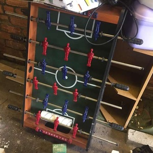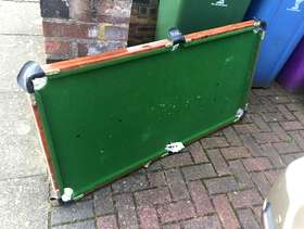 About 6foot by 3foot. No balls or cues. Also table football a bit smaller than the snooker table no legs. Been stored in garage so needs a wipe down