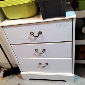 Small chest of drawers, white painted wood. 3 drawers with metal handles Solid but needs a clean. H 64cm x W 63cm x D 40cm GU14RU asap